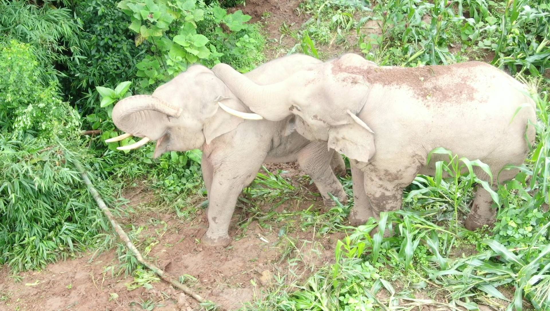 在云南,兩只亞洲象嬉戲中。 課題組航拍于云南