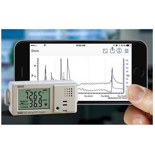 利用HOBOmobile APP(可前往AppStore即可輕松下載http://appstore.com/hobomobile),您即可使用您的手機(jī)或平板電腦(如iPad)等移動(dòng)設(shè)備輕松訪問30m(實(shí)際使用距離會(huì)受設(shè)備功率和障礙物影響)范圍內(nèi)任何一個(gè)MX1101無(wú)線溫濕度記錄儀。并對(duì)其進(jìn)行設(shè)置,也能夠以圖形方式顯示數(shù)據(jù),還可以選擇將您的測(cè)量數(shù)據(jù)存儲(chǔ)到云服務(wù)器。